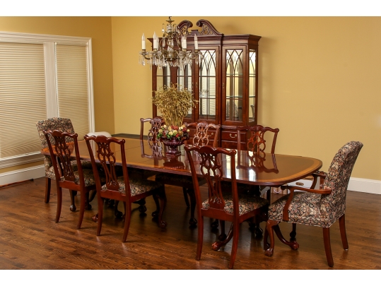 Set includes table, leaf, 2 captain chairs, 6 armchairs and roth china cabinet.
